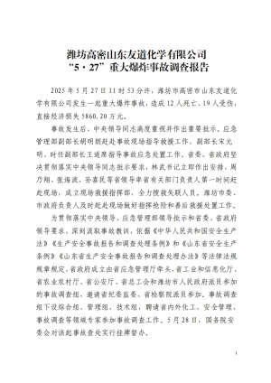 潍坊高密山东友道化学有限公司“5·27”重大***事故调查报告