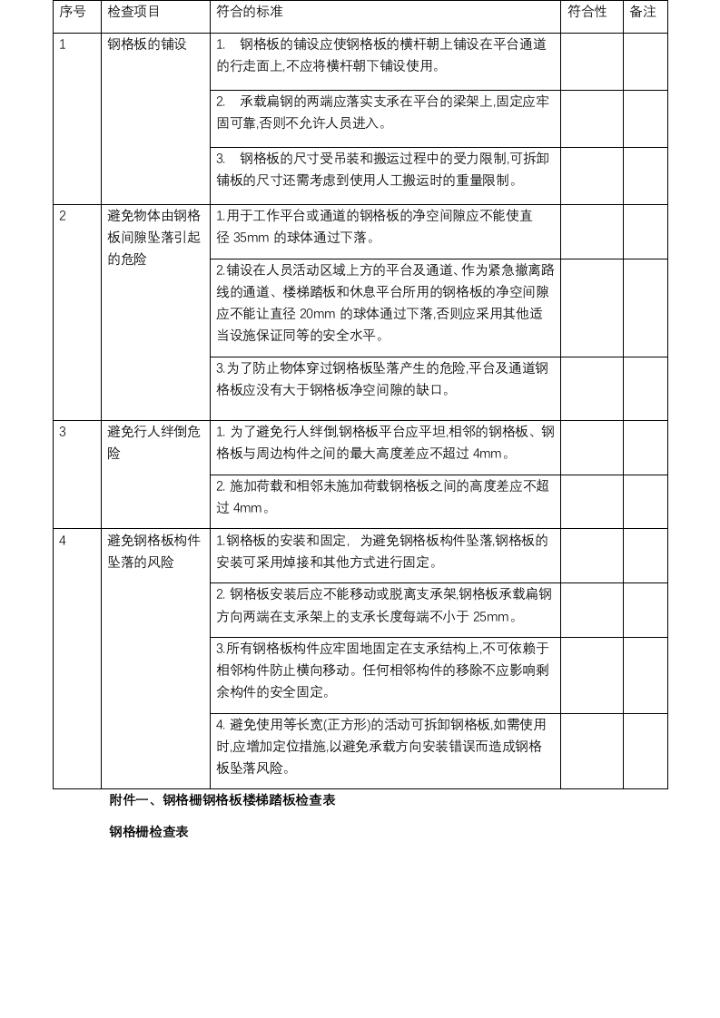 序号检查项目符合的标准符合性备注1钢格板的铺设1,钢格板的铺设应使钢格板的横杆朝上铺设在平台通道的行走面上,不应将横杆朝下铺设使用。2.承载扁钢的两端应落实支承在平台的梁架上固定应牢固可靠,否则不允许人员进入。3.钢格板的尺寸受吊装和搬运过程中的受力限制,可拆卸铺板的尺寸还需考虑到使用人工搬运时的重量限制。2避免物体由钢格1.用于工作平台或通道的钢格板的净空间隙应不能使直板间隙坠落引起径35mm的球体通过下落。的危险2铺设在人员活动区域上方的平台及通道、作为紧急撤离路线的通道、楼梯踏板和休息平台所用的钢格板的净空间隙应不能让直径20mm的球体通过下落,否则应采用其他适当设施保证同等的安全水平。3.为了防止物体穿过钢格板坠落产生的危险,平台及通道钢格板应没有大于钢格板净空间隙的缺口。3避免行人绊倒危1.为了避免行人绊倒,钢格板平台应平坦,相邻的钢格板、钢险格板与周边构件之间的最大高度差应不超过4mm。2.施加荷载和相邻未施加荷载钢格板之间的高度差应不超过4mm。避免钢格板构件1钢格板的安装和固定,为避免钢格板构件坠落钢格板的坠落的风险安装可采用焯接和其他方式进行固定。2.钢格板安装后应不能移动或脱离支承架钢格板承载扁钢方向两端在支承架上的支承长度每端不小于25mm。3.所有钢格板构件应牢固地固定在支承结构上,不可依赖于相邻构件防止横向移动。任何相邻构件的移除不应影响剩余构件的安全固定。4.避免使用等长宽(正方形)的活动可拆卸钢格板,如需使用时,应增加定位措施,以避免承载方向安装错误而造成钢格板坠落风险。附件一、钢格栅钢格板楼梯踏板检查表钢格栅检查表5.需要活动和可拆卸的钢格板,应用钢格板专用的安装夹具或者射钉紧固件固定好防止该构件的任何移位。安装夹根据需方要求可由生产厂供应,除不锈钢材料制造的安装夹外,碳钢制作安装夹和螺栓应经热浸镀锌或等效的表面处理,螺栓直径应不小于8mm,每件钢格板使用安装夹的数量应不少于4只。用射钉紧固件固定,射钉的穿透深度(指射钉尖端到基材表面的深度)应不小于10mm并满足工业平台设计所需要的紧固强度。射钉紧固件需根据使用环境选用适合的产品以满足防腐要求。在工业腐蚀环境中应使用不锈钢谢钉。6.为了查明任何腐蚀或任何危险的松动或夹紧件位置的变化,应随时对附件的紧固状态进行检查。5避免行人滑倒危1.钢格板宜具有较好的防滑性能,对于带坡度而坡度不超险过10°的工作平台或积存液体或油污的场合,宜选用齿型钢格板。2.超过10坡度的工作平台,应采取更为切实可行的防滑措施,以避免行人滑倒危险。6钢格板工作平台1.钢格板单人通道宽度宜不小于度宜增加至1200mm。通道尺寸2.钢格板通道如作为撒离路钢格反通道宽度应满足特定法规的要求。如果没有特定法规宽度路线镶格板通道宽度应增加至应不小于1600mm,高密度人群路线,镶格板通道宽度应增加至2000mm。钢格板楼梯踏板序号检查符合的标准符合性备注1踏板的长度等于梯宽.常用长度为600mm-2000mm。踏板宽度等于钢格板加上防滑突缘的宽度,通常为125mm-305mm。钢格板楼梯踏板应有防滑突缘突缘应贯穿整个踏板,突缘宽度不小于25mm,通常为30mm。突缘应能起到楼梯踏板级间视觉标记的作用,警示上下人员的踩踏安全。突缘是踏板负载区域的前沿是承受荷载的主