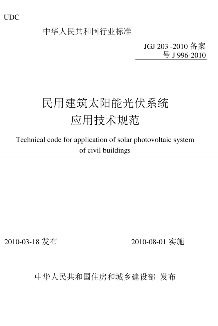 UDC中华人民共和国行业标准JGJ203-2010备案号J996-2010民用建筑太阳能光伏系统应用技术规范Technical code for application of solar photovoltaic systemof civil buildings2010-03-18发布2010-08-01实施中华人民共和国住房和城乡建设部发布中华人民共和国行业标准民用建筑太阳能光伏系统应用技术规范Technical code for application of solar photovoltaic systemof civil buildingsJGJ203-2010批准部门:中华人民共和国住房和城乡建设部施行日期:2010年8月1日中国建筑工业出版社2010北京
