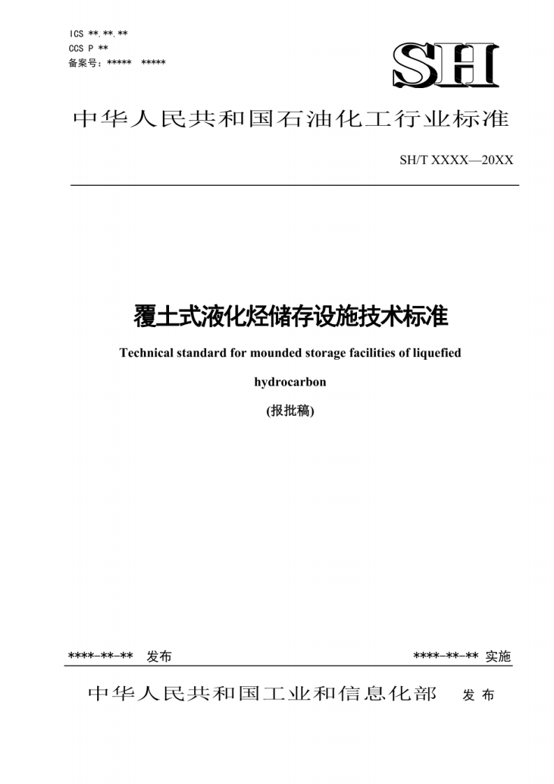 CCS P**备案号:****SH中华人民共和国石油化工行业标准SH/T XXXX-20XX覆土式液化烃储存设施技术标准Technical standard for mounded storage facilities of liquefiedhydrocarbon(报批稿)**-*—**实施中华人民共和国工业和信息化部发布目次前2规范性引用文件3术语和定义4基本规定35平面布置45.2罐组布置45.3与相邻设施间距6工艺、管道与自控设计46.1一般规定6.2工艺设计…6.3管道设计…6.4自控设计…67.1一般规定667.4荷载与工况7.5评定准则77.6防腐蚀7.7失效模式及预防…88地基、基础与覆土设计98.1一般规定…8.2荷载与地震作用98.3地基与基础8.4地基变形与监测8.5覆土…8.6其他119.1给排水9.2电气…1210.1一般规定…10.2消防给水系统11安全和环境保护12储罐制造.…12.1一般规定12.2组焊1312.3无损检测12.4焊后热处理12.5耐压试验和泄漏试验1412.6表面处理及防腐蚀…15