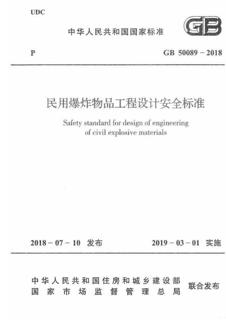 UDC中华人民共和国国家标准7PGB50089-2018民用爆炸物品工程设计安全标准Safety standard for design of engineeringof civil explosive materials2018-07-10发布2019-03-01实施中华人民共和国住房和城乡建设部联合发布国家市场监督管理总局中华人民共和国国家标准民用爆炸物品工程设计安全标准Safety standard for design of engineeringof civil explosive materialsGB50089-2018主编部门:中国兵器工业集团公司批准部门:中华人民共和国住房和城乡建设部施行日期:2019年3月1日中国计划出版社2018北京