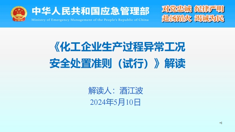 中华人民共和国应急管理部Ministry of Emergency Management of the People's Republic of China赴汤蹈火竭诚为贝《化工企业生产过程异常工况安全处置准则(试行)》解读解读人:酒江波2024年5月10日1中华人民共和国应急管理部Ministry of Emergency Management of the People's Republic of China目录出台背景主要内容及要点2