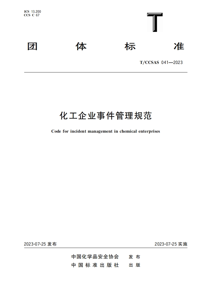CCS C 67团体标准T/CCSAS041-2023化工企业事件管理规范Code for incident management in chemical enterprises2023-07-25发布2023-07-25实施中国化学品安全协会发布中国标准出版社出版