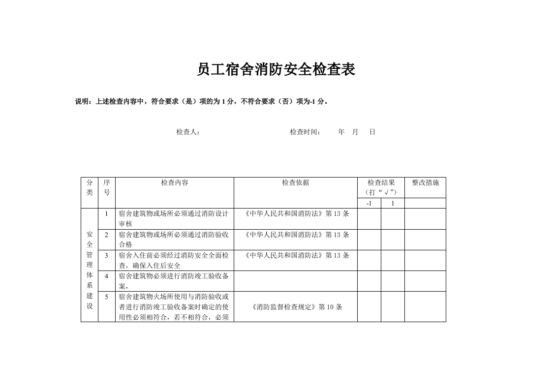 员工宿舍消防安全检查表说明:上述检查内容中,符合要求(是)项的为1分,不符合要求(否)项为-1分。检查人:检查时间:年月日分序检查内容检查依据检查结果整改措施类号(打“√”)-111宿舍建筑物或场所必须通过消防设计《中华人民共和国消防法》第13条审核安2宿舍建筑物或场所必须通过消防验收《中华人民共和国消防法》第13条全合格管3宿舍入住前必须经过消防安全全面检《中华人民共和国消防法》第13条理查,确保入住后安全体4宿舍建筑物必须进行消防竣工验收备系建5宿舍建筑物火场所使用与消防验收或设者进行消防竣工验收备案时确定的使《消防监督检查规定》第10条用性必须相符合,若不相符合,必须重新办理消防许可及验收备案手续6是否定期组织开展消防演练,并做好演练记录7宿舍公共区间内是否有固定的安全教育宣传标语和板报8是否开展消防安全教育9宿舍沿途道路(消防车通道)必须保持畅通《消防监督检查规定》第10条第6款10宿舍楼内消防间距不得被占用,消防《消防监督检查规定》第10条第6款间距的标准必须符合《建筑设计防火建规范》GBJ50016-201411防火分区不得改变和变更,防火分区筑《消防监督检查规定》第10条第6款的标准必须符合《建筑设计防火规范》GB50016-2014防12宿舍内的装修装饰材料必须符合消防技术标准。《中华人民共和国消防法》第60条第火一款第七项13宿舍周边生产、存储、经营场所与居住场所设置情况必须符合国家工程建《中华人民共和国消防法》第19条设消防技术标准:14宿舍楼的线路必须定期维护,同时必须符合消防技术标准和管理的规定,《中国人民共和国消防法》第27条电并做好维护记录