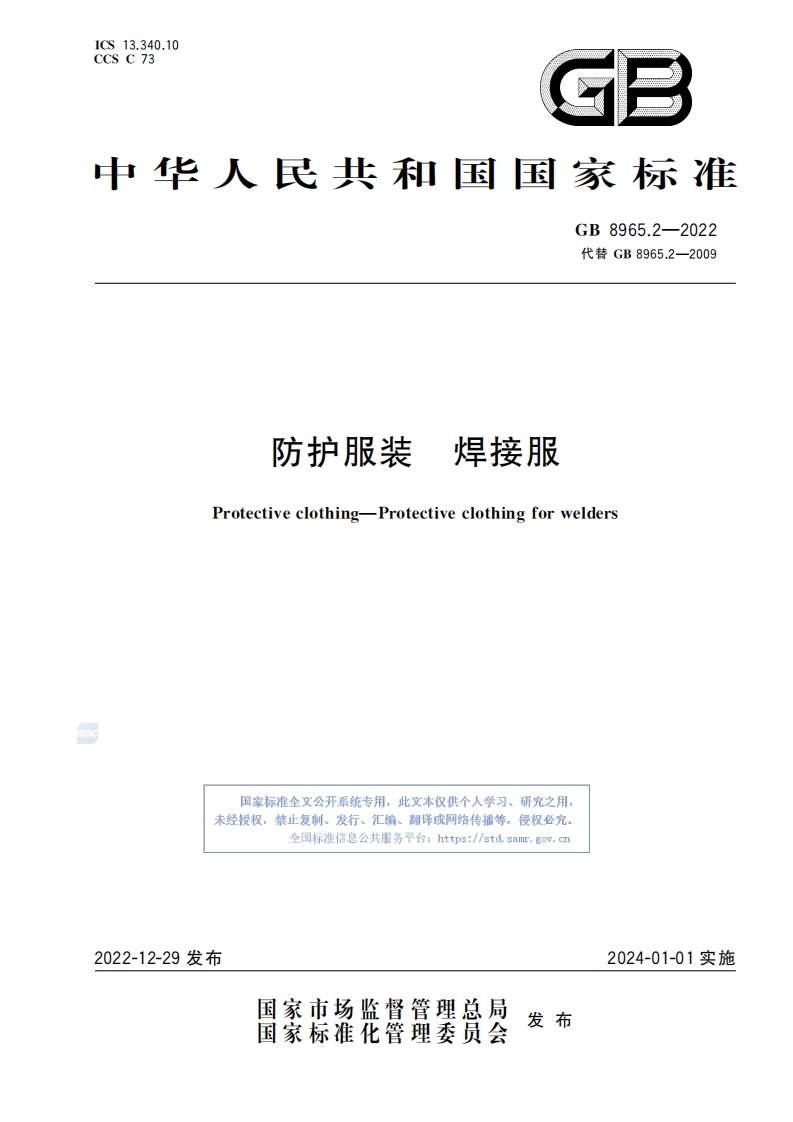 ICs13.340.10CCS C 73B中华人民共和国国家标准GB8965.2-2022代替GB8965.2一2009防护服装焊接服Protective clothing-Protective clothing for welders国家标准全文公开系统专用,此文本仅供个人学习、研究之用,未经授权,禁止复制、发行、汇编、翻译或网络传播等,侵权必究全国标准信息公共服务平台:https:/std.sam.gow.cm2022-12-29发布2024-01-01实施国家市场监督管理总局发布国家标准化管理委员会GB8965.2-2022目次前言2规范性引用文件3术语和定义24防护级别…35要求…6试验方法……7标识与包装6参考文献……8