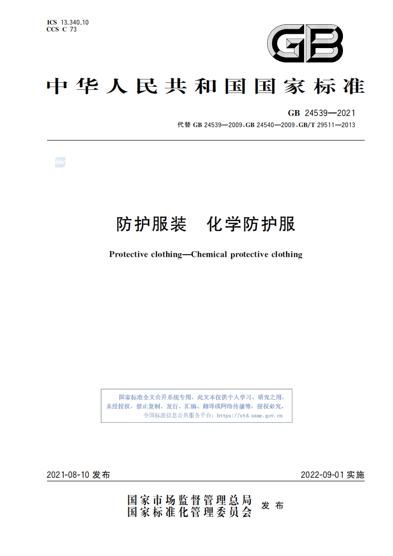 ICs13.340.10CCS C 73中华人民共和国国家标准GB24539一2021代替GB24539-2009,GB24540-2009,GB/T29511一2013防护服装化学防护服Protective clothing-Chemical protective clothing国家标准全文公开系统专用,此文本仅供个人学习、研究之用,未经授权,禁止复制、发行、汇编、翻译或网络传播等,侵权必究全国标准信息公共服务平台:https:/std.sam.gow.cm2021-08-10发布2022-09-01实施国家市场监督管理总局发布国家标准化管理委员会GB24539-2021目次12规范性引用文件…】4分型及代号35技术要求…1822附录A(规范性)化学防护服整体气密性测试方法…24附录B(规范性)化学防护服向内泄漏率的测试方法…26附录C(规范性)化学防护服液密性能测试方法……31附录D(规范性)固体颗粒物化学防护服向内泄漏率的测试方法…37附录E(规范性)实用性能测试评估的受试者动作…42附录F(规范性)液体耐压穿透性能测试方法…44附录G(规范性)织物酸碱类化学防护服面料穿透时间测试方法…55附录H(规范性)织物酸碱类化学防护服面料耐液体静压力测试方法…57附录I(规范性)化学防护服面料拒液性能测试方法…59附录J(规范性)化学防护服面料耐磨损性能测试方法…63附录K(规范性)化学防护服面料耐屈挠破坏性测试方法…65参考文献…67