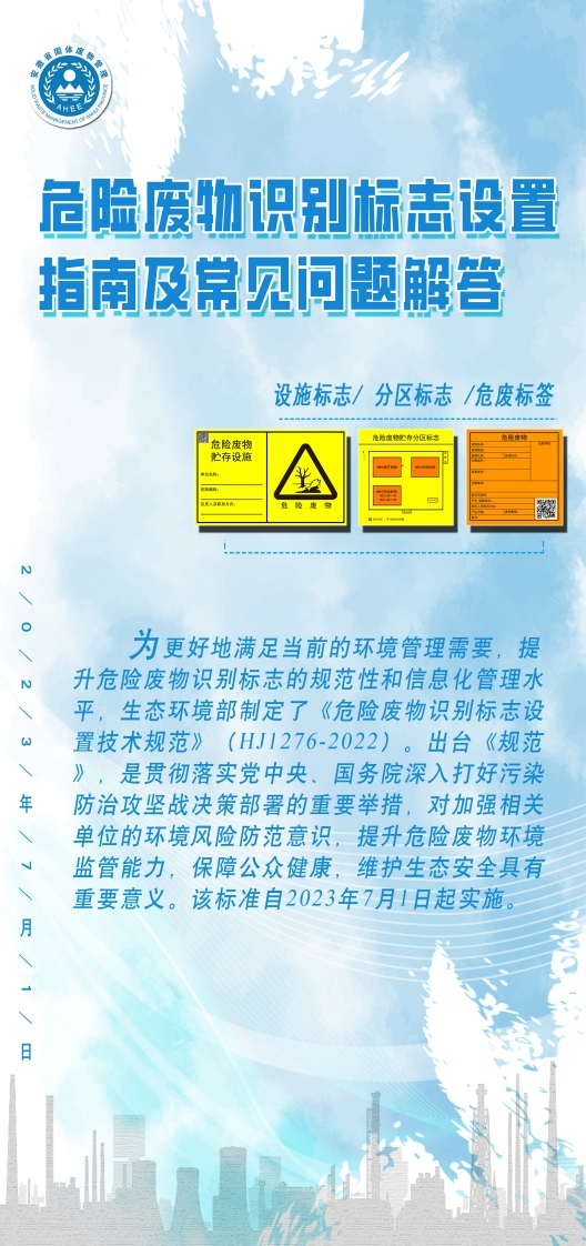 设施标志/分区标志/危废标签危险废物贮存设随为更好地满足当前的环境管理需要,提升危险废物识别标志的规范性和信息化管理水平,生态环境部制定了《危险废物识别标志设置技术规范》(HJ1276-2022)。出台《规范》,是贯彻落实中央、国务院深入打好污染年防治攻坚战决策部署的重要举措,对加强相关单位的环境风险防范意识,提升危险废物环境监管能力,保障公众健康,维护生态安全具有重要意义。该标准自2023年7月1日起实施。月日HAZARDOUS WASTE LABEL设置在危险废物容器或包装物上,由文字编码和图形符号等组合而成,用于向相关人群传递危险废物特定信息,以警示危险废物潜在环境危害的标志。1、样式危险废物废物名称:危险特性废物类别:废物代码:废物形态:主要成分:有害成分:注意事项:数字识别码:产生/收集单位:联系人和联系方式:产生日期:安物重量:备注:2、材质宜具有一定的耐用性和防水性。可采用不干胶印刷品或印刷品外加防水塑料袋或塑封。3颜色和字体应采用醒目的橘黄色为背景色,RGB颜色值(255,150,0)。标签边框和字体颜色为黑色,RGB颜色值(0,0,0)。宜采用黑体字的字体,其中危险废物字样加粗放大。