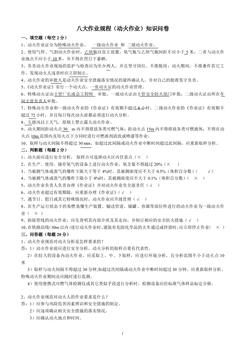 八大作业规程(动火作业)知识问卷一、填空题(每空2分)1、动火作业证分为特殊动火作业、一级动火作业和二级动火作业。2、使用气焊、气割动火作业时,乙炔瓶应直立放置,氧气瓶与乙炔气瓶间距不应小于5米,二者与动火作业地点不应小于10米,并不得在烈日下暴晒3、负责动火作业现场的监护与检查应为至少两人,并且坚守岗位、不准脱岗,动火期间,不准兼作其它工作,发现动火人违章时应立即制止。4、动火作业的审批人是动火作业安全措施落实情况的最终确认人,并对自己的批准签字负责。5、《动火作业证》实行一个动火点,一张动火证的动火作业管理。6、特殊动火证由主管厂长或总工程师审批,一级动火证由主管安全防火部门审批,二级动火证由所在车间主管负责人审批。7、特殊动火作业和一级动火作业的《作业证》有效期不超过8小时,二级动火作业的《作业证》有效期不超过72小时,并且每日每次动火前都必须进行动火分析。8、五级风以上天气,原则上禁止露天动火作业。9、动火期间距动火点30m内不得排放各类可燃气体:距动火点15m内不得排放各类可燃液体:不得在动火点10m范围内及用火点下方同时进行可燃溶剂清洗或喷漆等作业。10、取样与动火间隔不得超过30m,如超过此间隔或动火作业中断时间超过此间隔,应重新取样分析。二、判断题(每题2分)1、动火前应进行安全分析,取样点可选择动火区内任意点(×)2、在生产、使用、储存氧气的设备上进行动火作业,氧含量不得超过20%(×)3、当被测气体或蒸气的爆炸下限大于等于4%时,其被测浓度应不大于0.5%(体积百分数)(√)4、当被测气体或蒸气的爆炸下限小于4%时,其被测浓度应不大于0.1%(体积百分数)(×)5、动火作业负责人负责办理《作业证》并对动火作业负全面责任(√)6、动火作业超过有效期限,应重新办理《作业证》(√)7、遇节日、假日或其它特殊情况时,动火作业应升级管理(√)8、在生产运行状态下的易燃易爆生产装置、输送管道、储罐、容器等部位所进行的动火作业为一级动火作业(×)9、拆除管线的动火作业,应先查明其内部介质及其走向,并制订相应的安全防火措施(√)10、在铁路沿线(30m以内)进行动火作业时,遇装有危险化学品的火车通过或停留时,应立即停止作业(×)三、问答题(每题20分)1、动火作业规范对动火分析是怎样要求的?答:1)动火作业前应进行安全分析,动火分析的取样点要有代表性。2)在较大的设备内动火作业,应采取上、中、下取样,应进行环境分析,且分析范围不小于动火点10米3)取样与动火间隔不得超过30分钟,如超过次间隔或动火作业中断时间超过30分钟,应重新取样分析。特殊动火作业期间还应随时进行监测。4)使用便携式可燃气体检测仪或其它类似手段进行分析时,检测设备应经标准气体样品标定合格。2、动火作业规范对动火人的作业要求是什么?答:1)应参与风险危害因素辨识和安全措施的制定。2)应逐项确认相关安全措施的落实情况。3)应确认动火地点和时间。14)若发现不具备安全条件时不得进行动火作业。5)应随身携带《作业证》。八大作业规程(受限空间作业)知识问卷一、选择题(共10题,每题4分。每题的备选项中,至少有1个最符合题意)1、管道安全隔绝可采用(AB)进行隔绝。A.插入盲板B.拆除一段管道C.水封D.关闭阀门2、作业场所氧含量低于(A)时,禁止入内以免造成室息事故。A.18%B.19%C.20%D.23%3、在毒性气体浓度高,毒性不明或缺氧的可移动性作业环境中应选用(B)。A.双管式防毒口罩B.供氧式呼吸器C.面罩式面具D.单管式防毒口罩4、当被测气体或蒸气的犀炸下限大于等于4%时,可燃气体被测浓度不大于(B)(体积百分数)A.0.3%B.0.5%C.1%D.2%5、作业前(B)内,应对受限空间进行气体采样分析,分析合格后方可进入。A.20min B.30min C.60min D.120min6、以下有关设备内作业的说法错误的是(B)。A.进入设备前,必须将待检修设备与其他设备进行安全隔离,并置换、清洗干净B.在进入设备前必须取样分析,严格控制可燃气体、有毒气体浓度及氧含量在安全指标范围内,分析合格后才允许进入设备内作业。如在设备内作业时间长,也不再需要分析了C.设备内作业前要切断设备的电动和照明电源,并挂上“有人检修、禁止合闸”的牌子D.设备内作业,必须设专人进行监护,并与设备内人员保持联系7、在设备内进行检修作业,要求有足够的照明,设备内照明电压应不大于36V,在潮湿容器、狭小容器内作业应小于等于(A)V,灯具及电动工具必须符合防潮、防爆等安全要求。A.12B.15C.20D.308、下到污水池底部进行作业时,能够使用的防护器具有(AC)A.正压式空气呼吸器B.防尘口罩C.象鼻式全面罩D.棉布口罩9、受限空间监护人职责是(ACD)A.会同作业人员检查安全措施,统一联系信号。B.进入受限空间监护。C.当发现异常时,向作业人员发出撤离警报。D.掌握应急救援的基本知识。10、在受限空间作业中下列做法错误的是(ADA.长时间在受限空间作业。B.受限空间出入口应保持通畅。C.每隔2-3小时监测一次。D.在有毒雾气较大的环境下,摘下面具擦拭。二、判断题(每题2分)1、采用管道送风时,送风前应对管道内介质和风源进行分析。(√)2、可以向受限空间充氧气或富氧空气。(×)3、容积较大的受限空间采样点,应采取上、中、下各部位取样。(√)4、涂刷有挥发性溶剂的涂料时,应每隔2个小时进行一次分析。(×)5、受限空间