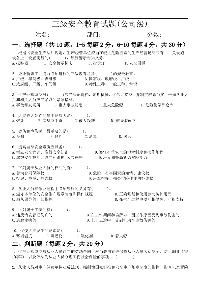 三级安全教育试题(公司级)姓名:部门:分数:一、选择题(共10题,1-5每题2分,6-10每题4分,共30分)1.根据《安全生产法》规定,生产经营单位应当在较大危险因素的生产经营场所和有关设施、设备上,设置明显的(),履行警示告知义务。A.报警器B.安全警示标志C.指示灯D.安全围栏2.企业新职工上岗前必须进行的三级教育是指()的安全教育。A.厂级、车间级、班组级B.国家级、政府级、厂级C.政府级、厂级、车间级D.特殊工种、一般工种、常识3.生产经营单位对()应当登记建档,定期检测、评估、监控,并制定应急预案,告知从业人员和相关人员应当采取的紧急措施。A.事故频发场所B.重大事故隐患C.重大危险源D.危险化学品仓库4.火灾致人死亡的最主要原因是()。A.烧死B.室息或中毒C.被人践踏D.被物体砸中5.烫伤和烧伤时,最重要的是()。A.冷却B.包扎C.消毒D.送诊6.提高自身安全素质应具备(A.树立安全意识、懂得安全知识B.遵守有关安全的规章制度和操作规程C.掌握安全技能,遵守和维护公共秩序D.培养和提高紧急避险能力7.下列属于从业人员的权利的有()。A.劳动合同保障权B.危险、有害因素的知情、建议权C.批评、检举、控告权D.违章指挥、强令冒险作业的拒绝权8.从业人员在作业过程中必须履行的义务有()。A.遵守本单位的安全生产规章制度和操作规程B.正确佩戴和使用劳动防护用品C.服从领导的一切指挥D.在生产过程中要互相提醒,互相支持9.下列属于工伤的有(A.违反治安管理伤亡的B.在工作期间和场所内,因工作原因受到事故伤害的C.患职业病的D.上下班途中,受到机动车事故伤害的10.促使火灾发生的要素是(A.环境温度B.可燃物C.氧化剂D.着火源二、判断题(每题2分,共20分)1.生产经营单位与从业人员订立的劳动合同,应当载明有关保障从业人员劳动安全、防止职业危害的事项,以及依法为从业人员办理工伤社会保险的事项。(2.从业人员对生产经营单位违反法规、强制性国家标准和安全生产规章制度的指挥、指令以及冒险作业等有权拒绝执行。(3.从业人员可以边上岗作业边进行上岗安全生产教育和培训。(4.生产经营单位使用被派遣劳动者的,被派遣劳动者享有《安全生产法》规定的从业人员的权利,并应当履行其规定的从业人员的义务。()5.生产经营单位对接收的中等职业学校、高等学校的实习学生无需进行相应的安全生产教育和培训,但必须提供必要的劳动防护用品。(6.用人单位应当依法建立和完善规章制度,保障劳动者享有劳动权利和履行劳动义务。(7.产经营单位从业人员发现事故隐患或者其他不安全因素,应当立即向安监部门报告,不可向现场安全生产管理人员报告。(8.事故调查组有权向有关单位和个人了解与事故有关的情况,并要求其提供相关文件、资料,有关单位和个人不得拒绝。(9.用人单位应当采取有效的防护措施,预防职业中毒事故的发生,依法参加工伤保险,保障劳动者的生命安全和身体健康。(ノ10.任何单位和个人发现有可能危及燃气设施和安全警示标志的行为,有权予以劝阻、制止。(三、填空题(每空1分共20分)1.安全生产工作的十二字方针是(),()。2.企业消防工作应贯彻(),()方针。3.按照人体触电及带电体的方式和电流通过人体的途径,触电可分为(),(4.尤其是操作旋转机械的人员,一定要保证其工作服“三紧”,即:((5.安全色包括(),()。6.三违作业是指:(),()。7.安全生产责任制是企业岗位责任制的一个组成部分,是企业最基本的安全制度,是安全规章制度的核心,安全生产责任制的实质是(),(四、简单题。(每题10分,共30分)1.安全生产中的“四不放过原则”是指什么?