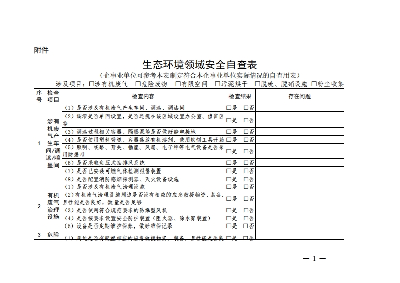 附件生态环境领域安全自查表(企事业单位可参考本表制定符合本企事业单位实际情况的自查用表)涉及项目:口涉有机废气口危险废物口有限空间口污泥烘干口脱疏、脱硝设施口粉尘收集序检查号项目检查内容检查结果存在问题(1)是否涉及有机废气产生车间、调漆、调漆间(2)调漆是否单问设置,是否违规在该区城设置办公室、值班区涉有口是口否机废(3)调漆过程相关容器、隔膜泵等是否做好静电接地气产生车(4)是否使用塑料管道、容器盛放有机溶剂,使用铁制工具开箱口是口否间/调(⑤)照明、线路、开关、插座、风扇、电子秤等电气设备是否采口是墨间(6)是否采取负压式抽排风系统(7)是否已安装可燃气体检测报警装置(8)是否配置消防感烟探测器、灭火设备设施(1)是否涉及有机废气治理设施口是口否有机(2)有机废气治理设施周边是否设有相应的应急救援物资、装备,2废气且性能是否良好,数量是否足够治理(3)是否使用符合规范要求的防爆型风机口是口否设施(4)是否按要求设置安全防护装置(阻火器、除水雾装置)(5)设备是否定期维护保养,做好维保记录3危险,数量是否足够(2)现场是否张贴危险废物安全警示标志,明确品种、安全属性废物最大储存量和储存期限,明确应急救援和灭火方法贮存(3)危废仓是否设置在室外安全位置,与周边可燃物品或动火作处置业保持有效安全间隔,且通风良好口是安全(4)现场是否已采取防有机蒸气积聚的控制措施,如安装排气扇,包装桶加盖或用保鲜膜封口等口否(5)是否已采取防风、防晒、防雨淋措施(1)是否完整识别企事业单位内部涉及污水处理池等有限空间,睫立台账,制定有限空间安全管理制度,明确相应的责任人口是口否环境(2)现场是否设置有限空问安全警示标志、标识和告知牌治理(3)是否委托外包作业,并签订安全责任书设施(4)是否严格执行有限空问作业审批机制,全过程专人管控有限(5)是否定期组织项目负责人、现场监督人员、作业人员以及救空间暖人员开展有限空问安全教育培训口是口否安全(6)是否制定有限空间应急救援预案并定期组织开展演练(7)是否有配置充足的有限空间救援装备,明确标识并就近放置做好日常检查维护保养工作口是口否5污泥(1)是否涉及可燃粉尘污泥供干设施运行烘干(2)是否落实操作员工的安全生产“三级教南”工作:安全做好设施肢术交底和安全操作规程的培训考核工作口是口否运行(3)是否落实系统内氧气含量实时监测和可燃粉尘惰化工作安全(4)定期维护保养系统安全报警设施,确保持续安全运行(5)电气设备是否接地,电线是否绝缘可靠并在钢管内铺设